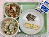 今日(明日)の給食の献立は、肉豆腐、ポテトサラダ、しそ味ひじき、麦ごはん、牛乳でした。