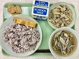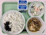今日の給食の献立は、キムタクごはん、根菜のつくね、かき玉汁、おからクッキー、牛乳でした。。