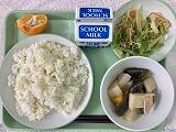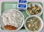 今日の給食の献立は、クッパスープ、大根のナムル、ヤンニョムチキン、麦ごはん、牛乳でした。本校では食育と異文化理解を組み合わせて世界の料理を給食で今週から提供しています。昨日まではタイ料理、今日からは韓国料理でした。