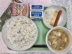 今日の給食の献立は、県産まぐろの曙焼き、チデークニイリチー、お雑煮、麦ごはん、牛乳でした。