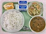 今日の給食の献立は、紅芋入りカレー、雑穀ごはん、たくわん和え、牛乳でした。