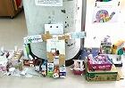 1年生は図工の授業でお菓子や牛乳、ティッシュなどの様々な大きさの箱を組み合わせて、ロボットや車、生き物などを作っていました。完成後は写真を撮り、クラスのみんなに工夫したところなどの説明を加えながら自分の作品の紹介していました。