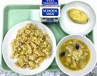 今日の給食の献立は、メキシカンライス、ほうれんそうオムレツ、豆と野菜のスープ、牛乳でした。