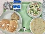今日の給食の献立は、マッシュルームスープ、ブロッコリーサラダ、もみの木型ハンバーグ、手作りカップケーキ、あみパン、牛乳でした。