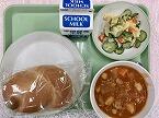 今日の給食の献立は、鶏肉とひよこ豆のトマト煮、アスパラサラダ、あみパン、牛乳でした。