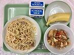 今日の給食の献立は、ペペロンチーノ、ポテトリヨネーズ、バナナ、牛乳でした。