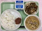 今日の給食の献立は、もずく丼、かき玉汁、牛乳でした。