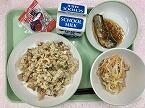 今日の給食の献立は、いわしのおかか煮、白菜の和え物、大豆入り炊き込みごはん、節分豆、牛乳でした。