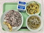 今日の給食の献立は、中身汁、五色和え、魚の天ぷら、黒米ごはん、牛乳でした。