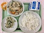 今日の給食の献立は、こうや豆腐の卵とじ、切り干し大根と小松菜のゴマ和え、ごはん、牛乳でした。