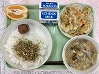 今日の給食の献立は、煮つけ、おかか和え、タケノコごはん、きよみオレンジ、牛乳でした。