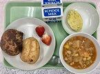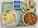 今日の給食の献立は、ポークビーンズ、カリフラワーのマリネ、コーンチーズトースト、牛乳でした。