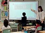 1年1組は算数の学習で文章問題を読み、大きい方の数の求め方について考えていました。2組は、電子黒板にうつされた花壇を見て、「どちらが広いか」と問題に対し、児童は、たてと横のブロックの数の違い等を根拠に説明しながら考えていました。