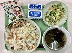 今日の給食の献立は、魚の塩麹焼き、梅鰹和え、鶏とごぼうの炊き込みごはん、サーターアンダギー、牛乳でした。