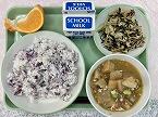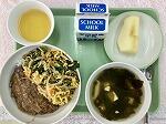 今日の給食の献立は、ビビンバ、わかめスープ、麦ごはん、りんご、牛乳でした。
