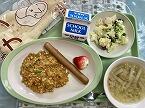 今日の給食の献立は、ウインナー、キ-マカレー、豆豆サラダ、白菜とベーコンのスープ、いちご、ナン、牛乳でした。