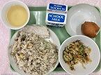 今日の給食の献立は、チキナーチャンプルー、ぐるくんシークァーサーソース、もずくのすまし汁、ごはん、美ら豆、牛乳でした。