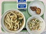 今日の給食の献立は、カレーうどん、ごぼうとナッツのサラダ、大学芋、牛乳でした。