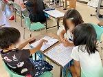 2年1組はタンバリンやカスタネット、マラカス等を使って2拍子のリズム打ちの練習に取り組んでいました。2組は100をこえる数の習得を図っていて、友だち同士で丸つけしあいながら、教え合っていました。