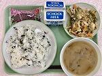 今日の給食の献立は、ゴーヤーチャンプルー、イナムドゥチ、ワカメごはん、紅芋タルト、牛乳でした。