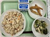 今日の給食は、きびなごからあげ、きゅうりとイカのサラダ、大豆いり炊き込みごはん、牛乳でした。