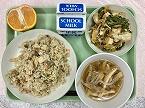 今日の給食の献立は、チキナーチャンプルー、シカムドゥチ、アーサ入り炊き込みごはん、たんかん、牛乳でした。