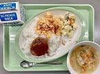 今日の給食の献立は、ロコモコ、カリフラワーのマリネ、野菜のスープ、ごはん、牛乳でした。