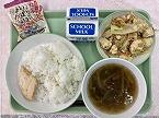 今日の給食の献立は、豆腐チャンプルー、魚のシークァーサーの味噌焼き、アーサ汁、ごはん、紅芋まんじゅう、牛乳でした。