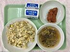 今日の給食の献立は、高菜チャーハン、魚のチリソースかけ、春雨スープ、牛乳でした。
