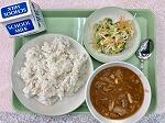 今日の給食の献立は、ハヤシライス、豆苗とキャベツのゴマ和え、麦ごはん、牛乳でした。