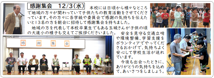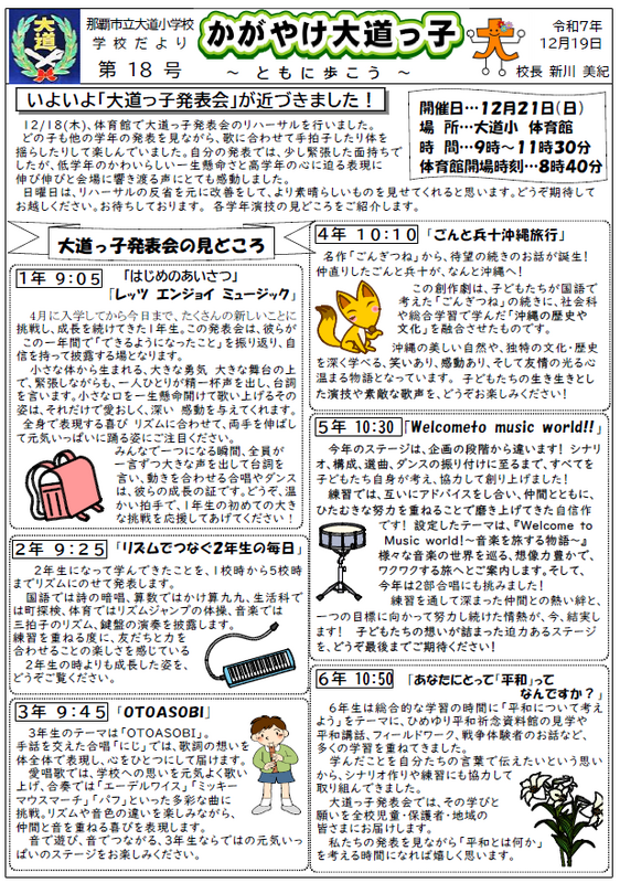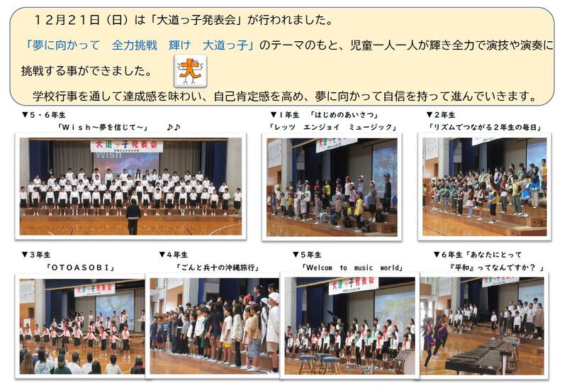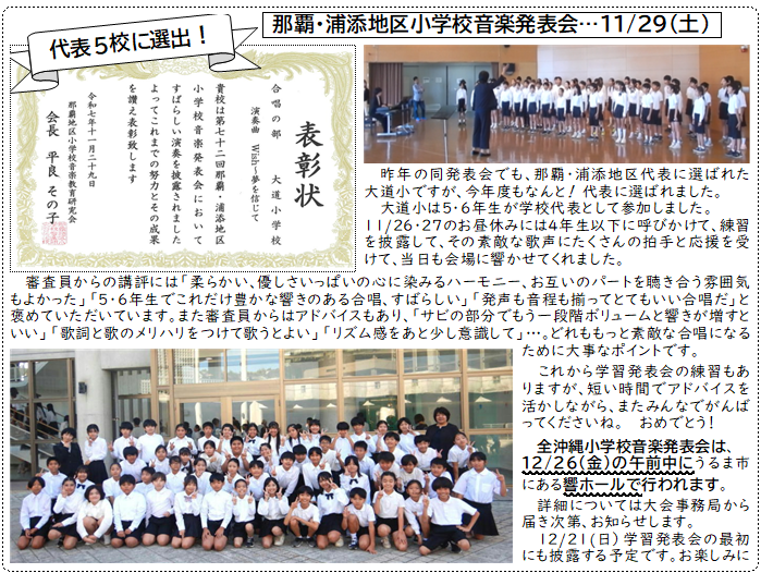 9時から、5・6年生の合唱があります。12/26(金)にうるま市民劇 場響ホールで行われる全沖縄学校音楽発表会に那覇・浦添地区代表として出場します。当日観にいけない方は是非、来校してお聞きください。