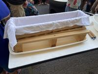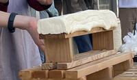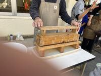 続いて木枠型にゆしどうふを入れて固めます。