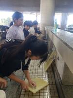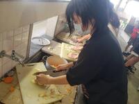 午後のプログラム②野外炊飯の様子です。青少年の家の職員から説明を聞いて、各班で協力して火をおこしたり、食材を切ったり、頑張っている様子がうかがえます。
