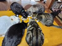 さくらねこ(手術済猫の耳の形)保護猫たちの食事風景(後ろに犬が...) 肩のりねこ こねこ