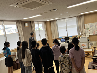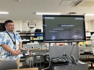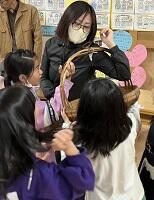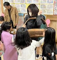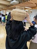3年生が、壺屋焼き物博物館から学芸員のみなさんに来ていただいて、昔の道具について説明してもらったり、触らせてもらったりしました。 ばーき(カゴ)を持っておでかけしそうなともえ先生↓