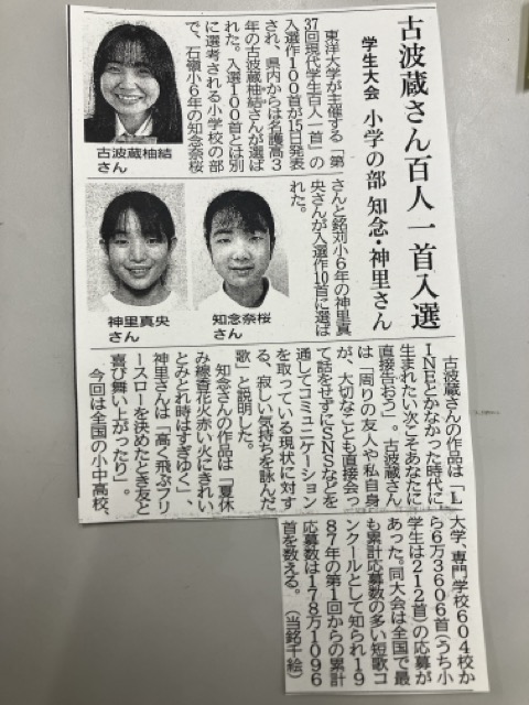 今日の新聞に! 投稿日時 : 2024/01/23 情報担当 6年生のおともだちが載っています。「第37回現代学生百人一首」小学生の部で入選したそうです。すごいですね!1月23日琉球新報よりIMG_6744(中)百人一首.jpeg 0 {{options.likeCount}} {{options.likeCount}}