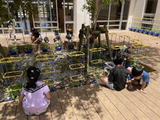 3年生が理科の観察のために植えているキャベツに蝶々がたまごをうみつけていました。