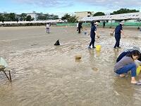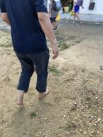 子どもも保護者も先生も一緒にスポンジ吸水! はてしない水たまり 誰の足でしょうか?