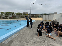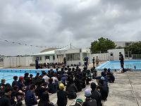 始業式開始のあいさつをする教頭先生 石嶺小校歌 きれいな歌声です