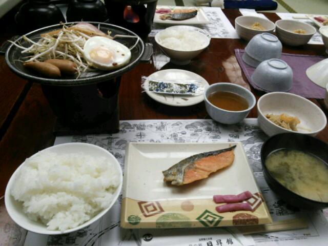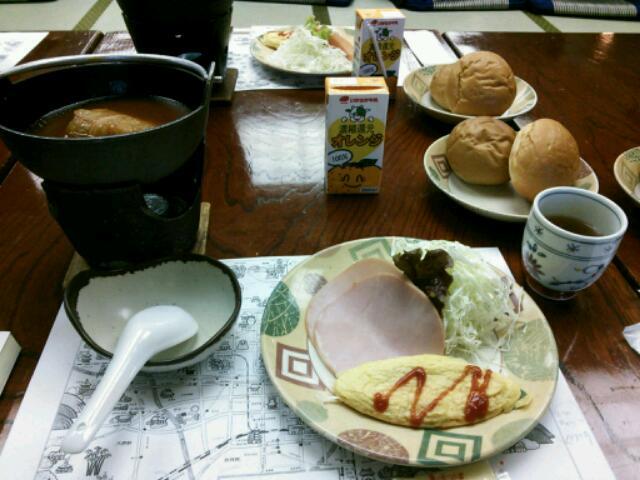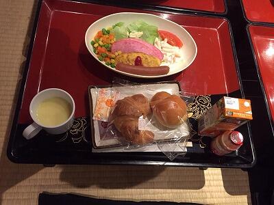 朝食は、パン、ロールキャベツ、野菜、ハム、オレンジジュースです。今日は生徒が大好きなユニバーサルジャパンです。