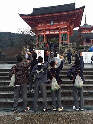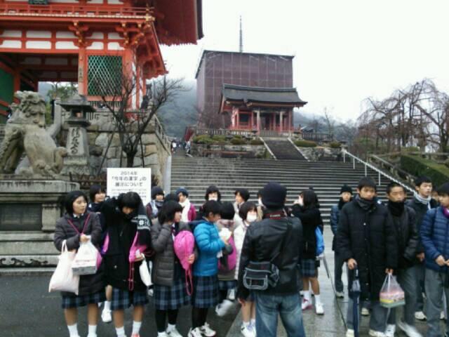 16時半、京都班別自主学習おわり、清水寺で記念撮影です。地元の特産も味見しました