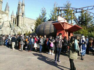 ハリーポッターの前で、バタービール購入(700円)のため並んでます。