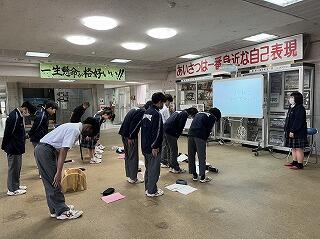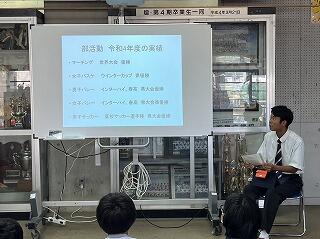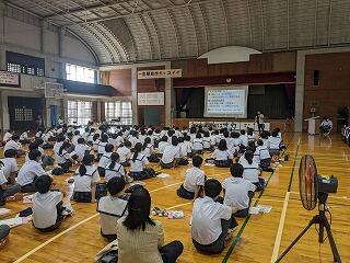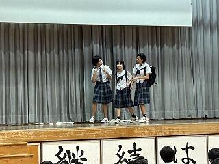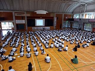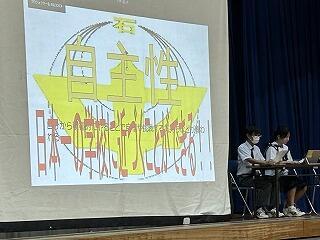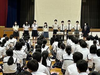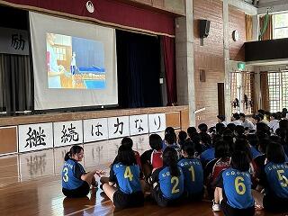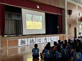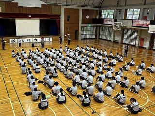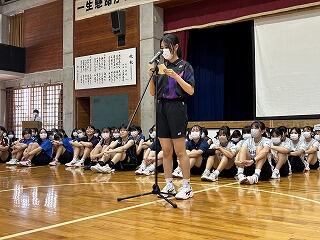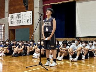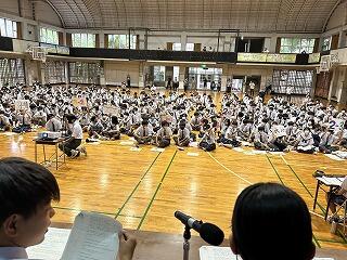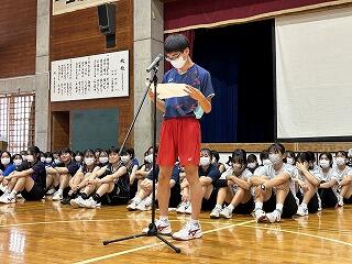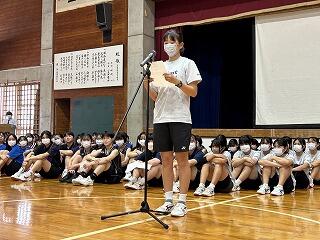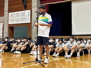 出場選手はユニフォームで参加し、各部キャプテンの意気込みをみんなで聞き、久しぶりに体育館でその雄姿を見ながら激励することができました。力強い決意表明と、生徒会が制作した激励ムービーの上映があり、日々頑張って練習している様子を見ることができました。