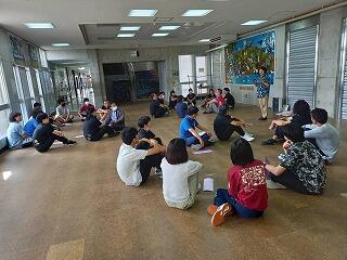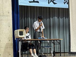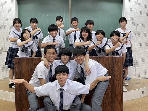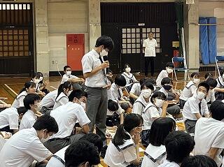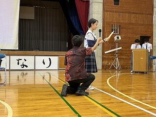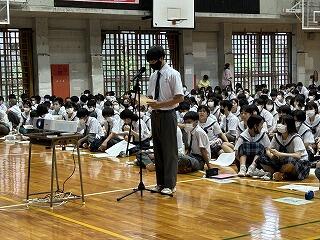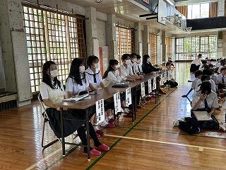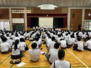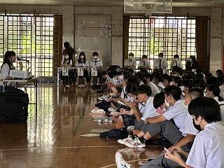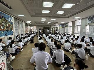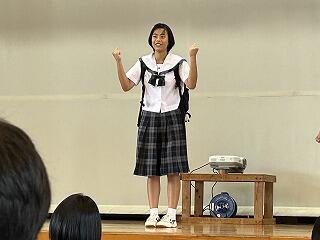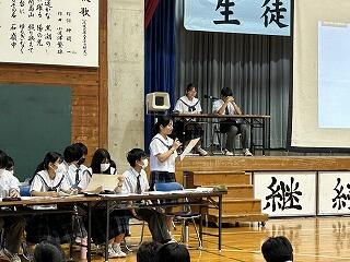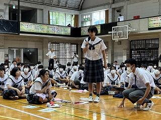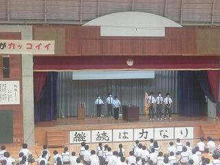 うちなーぐちをもっともっと中学生にも身近に感じてもらいたい。そのよさ、親しみやすさを何を切り口に伝えようかと、生徒会、放送委員はじゅん選手や首里のすけさんと数回の会議を経て今日の日を迎えました。