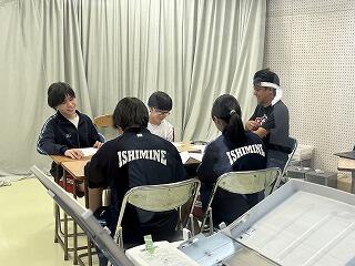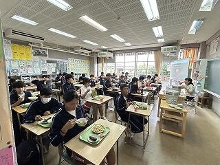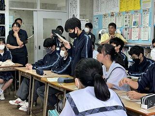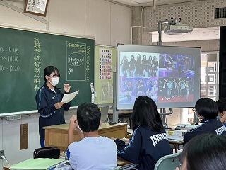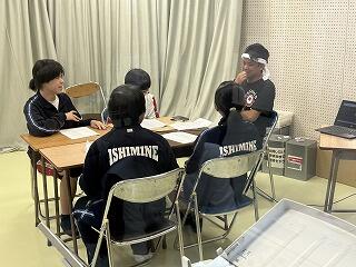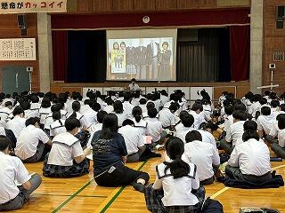 じゅん選手が出したうちなーぐちクイズ1問について、4名の総務の皆さんが切り込みました。きっと給食を食べながら教室の皆さんも楽しんでくれたと思います。じゅん選手がうちなーぐちを大切にしている姿は、嶺中生にどのようにうつったでしょうか?楽しみながら自然と郷土の言葉に親しむ素敵な機会となりました。