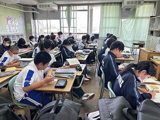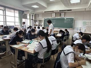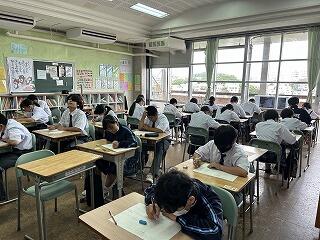 1年3組の数学の時間は単元テストを行っていました。まとまりごとで評価をしっかりと行っています。このような小テストへの向き合い方も変わってきているように感じます。