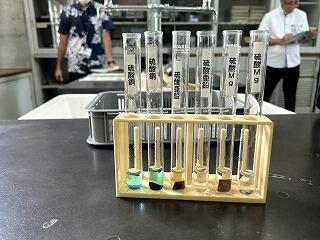 本日1校時、3年2組で初任研の研究授業が行われました。授業者は清水香穂先生です。「化学変化とイオン」の単元で、今日のテーマは「金属によって陽イオンへのなりやすさに差はあるのだろうか?」でした。