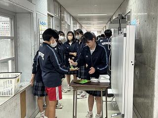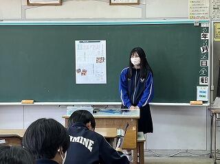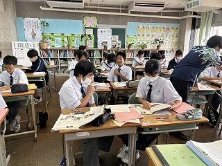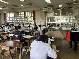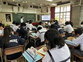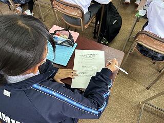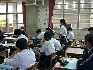 1、2校時に今日の授業の様子を見てまわりました。3年1組の家庭科の授業では身に付けた帯結びの実技テストが行われていました。時間内に手順に沿って結べているか、みんな真剣な表情で取り組んでいました。