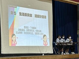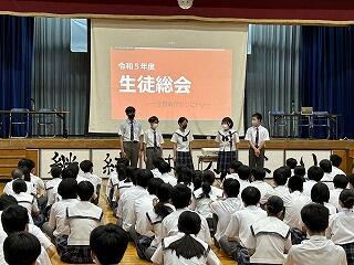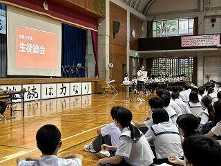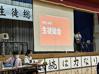 本日、令和5年度生徒総会が行われました。生徒会役員の皆さんも、体育館で全校生徒が集まっての総会の形式は初めての経験で、しっかかりと準備、リハーサルを重ねて今日の日を迎えました。