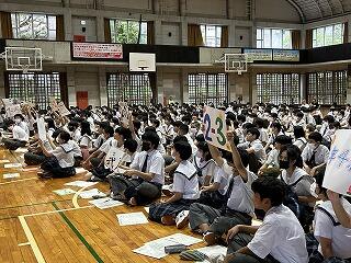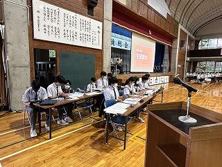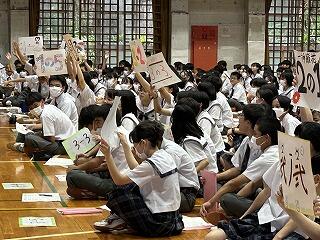 そして、第5号議案では、新嶺中3ヵ条の提案が総務から出されました。「あいさつ」「リスペクト」に続く三つめは「自主性」です。全校生徒の承認の拍手で、嶺中生が推進する嶺中3ヵ条が決定しました。すべての議案の提案の後、議長団の進行で質疑応答が行われます。質疑のある学級がプラカードを掲げて、元気よく「ハイ!」と挙手していました。